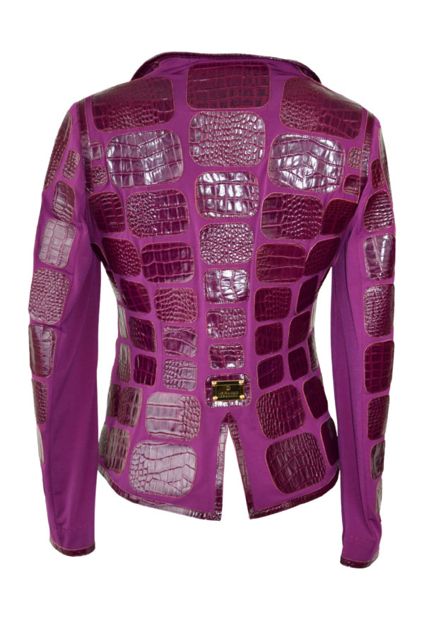 Diese Couture Jacke wird aus einem pflegeleichten Jersey gefertigt und mit Krokopatches appliziert. Durch das individuelle Ansetzen der Patches entsteht eine perfekte Silhouette. Die seitlich angesetzte Multisize-Schnürung ermöglicht es, die Passform und die Taillierung individuell anzupassen.