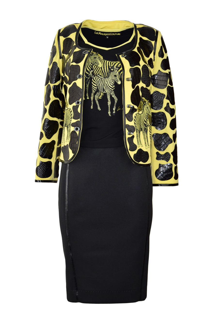 Die Couturejacke ist aus pflegeleichtem Jersey, mit Krokopatches appliziert und mit einem von Liz Malraux entwickelten Stickmotiv 12-farbig bestickt.