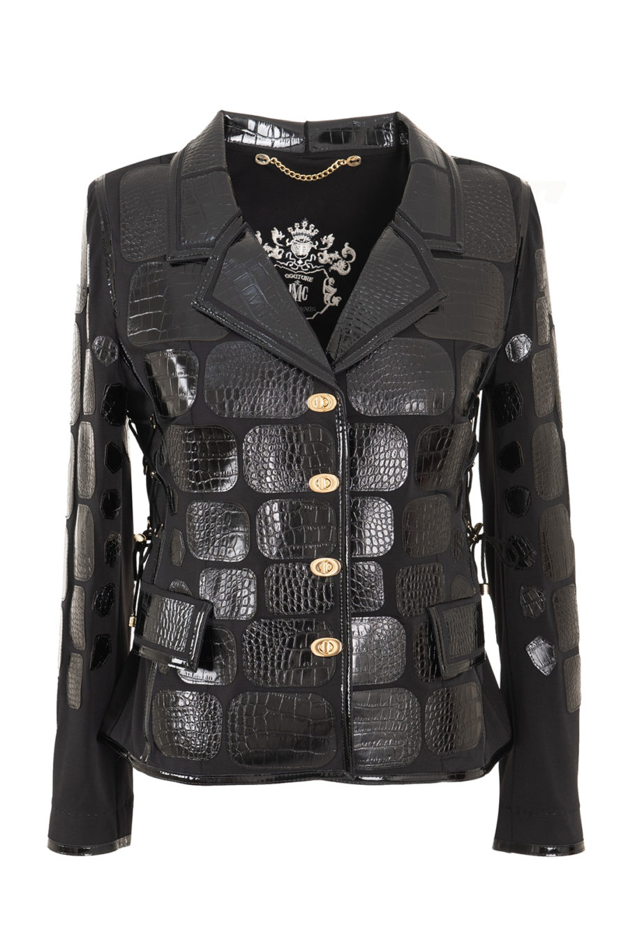 Kurzblazer mit Lederpatches in Kroko-Optik, vergoldeten Drehverschlüßen, Revers, Pattentaschen und Multisize Schnürung