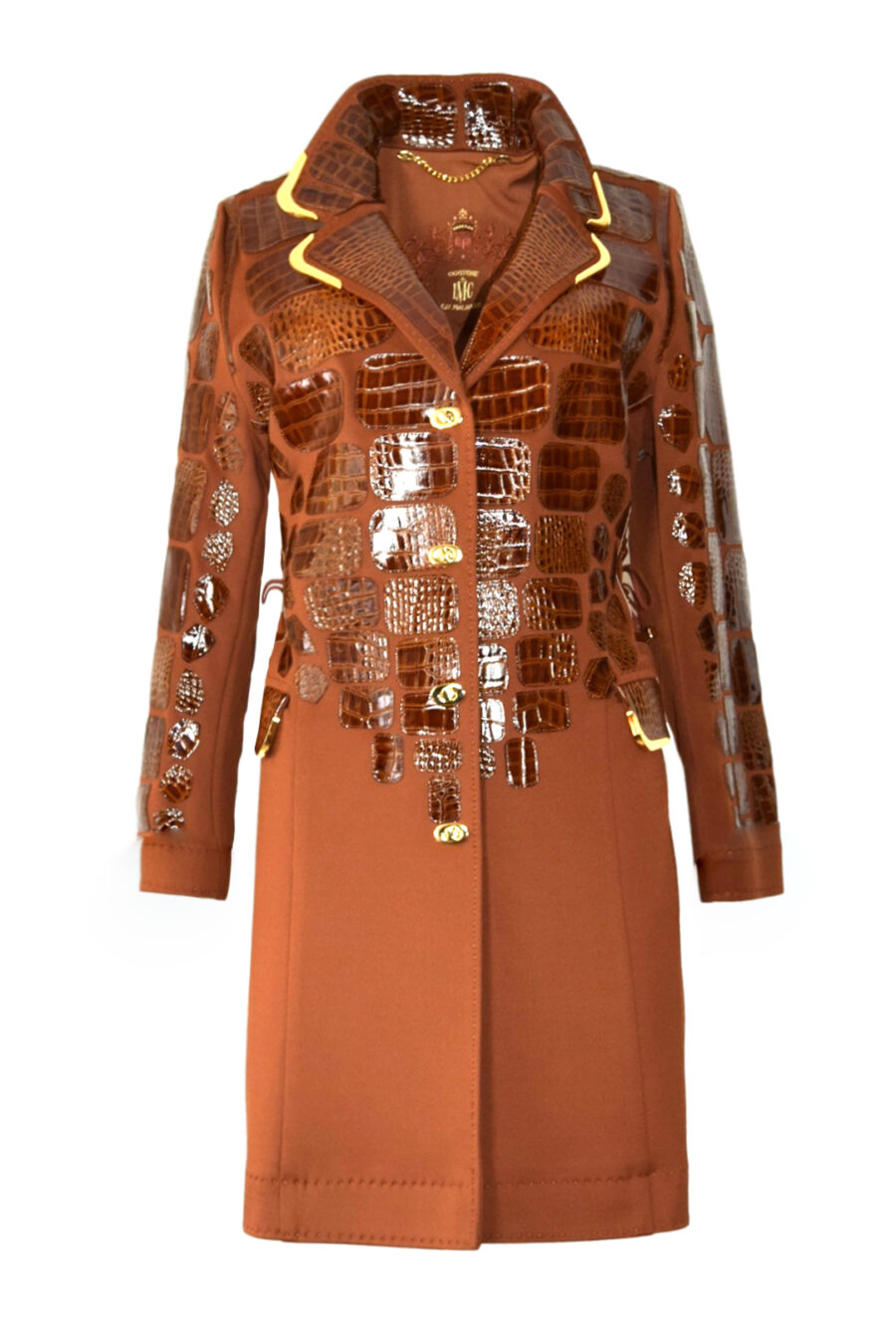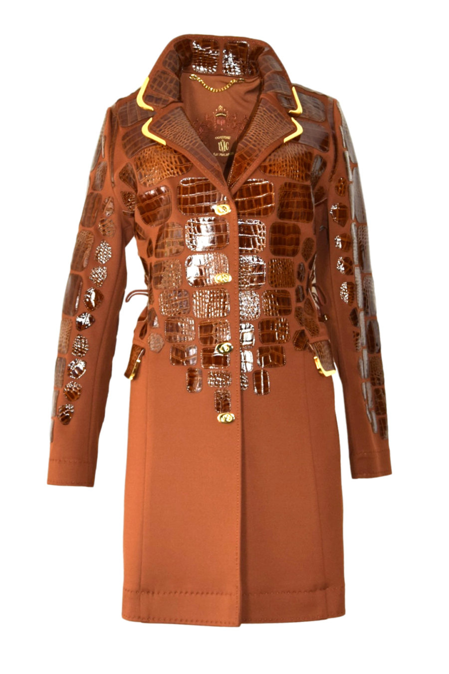 Diese Couture Jacke wird aus einem pflegeleichten Jersey gefertigt und mit Krokopatches appliziert. Durch das individuelle Ansetzen der Patches entsteht eine perfekte Silhouette. Die seitlich angesetzte Multisize-Schnürung ermöglicht es, die Passform und die Taillierung individuell anzupassen.