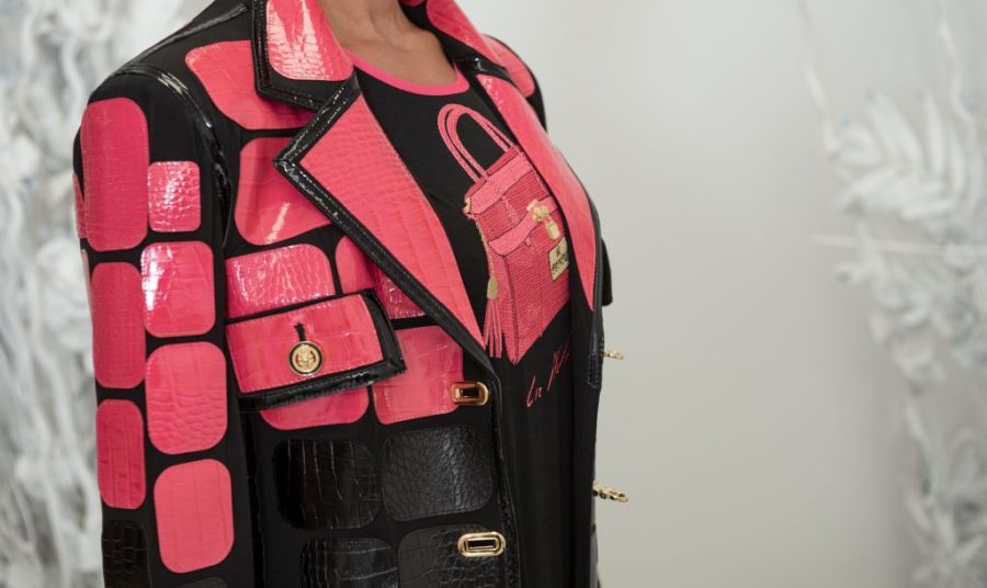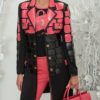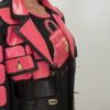 Longblazer mit 4 Pattentaschen mit Patches in Krokooptik in Flamingo und schwarz, mit hartvergoldeten Klappverschlüssen.