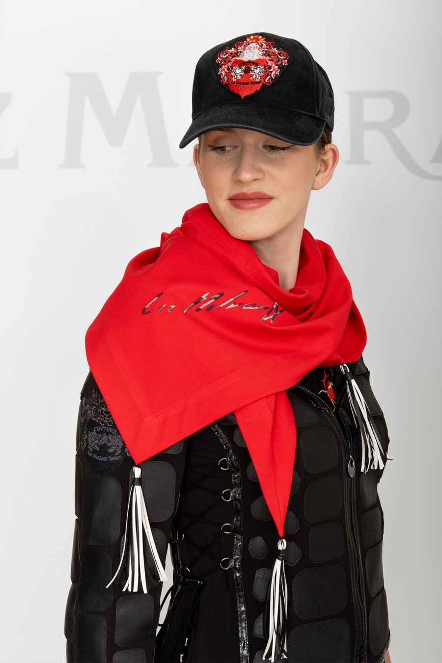 Maxi Tuch aus Viskose-Jersey, mit 3 Eco-Wildleder Quasten, und “Signatur-embroidery”