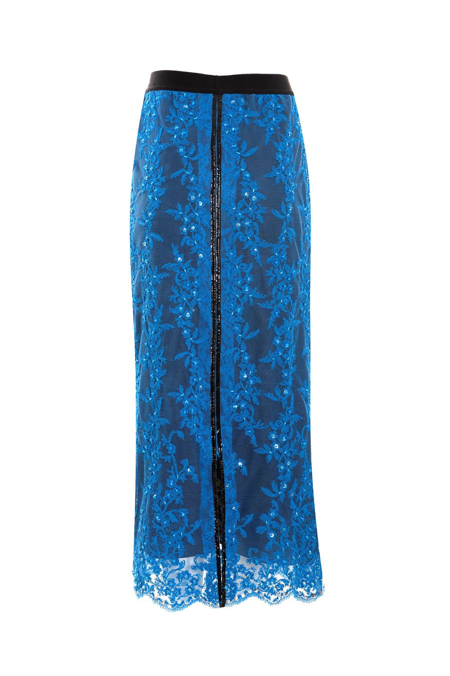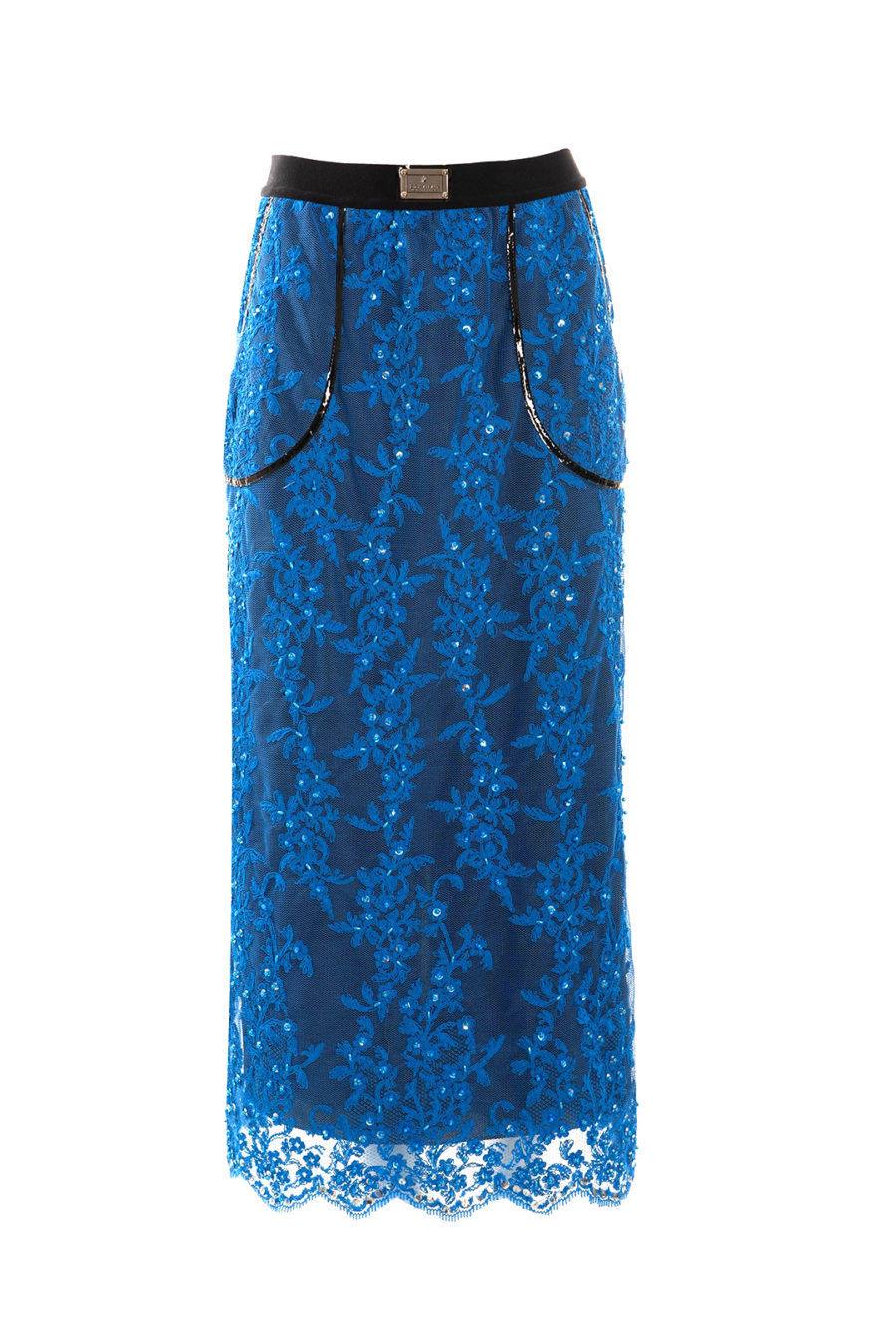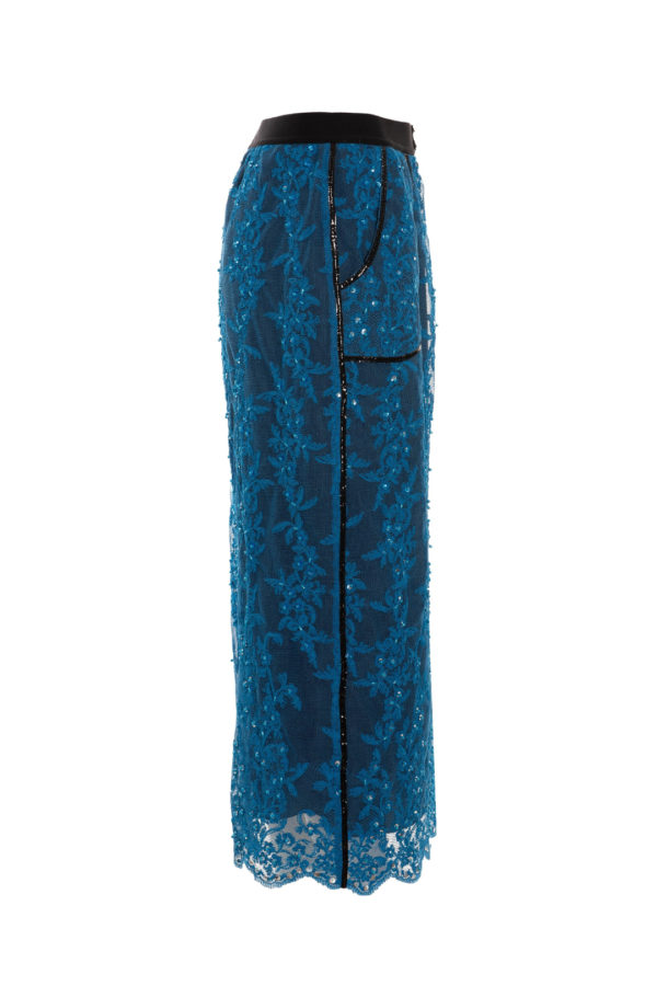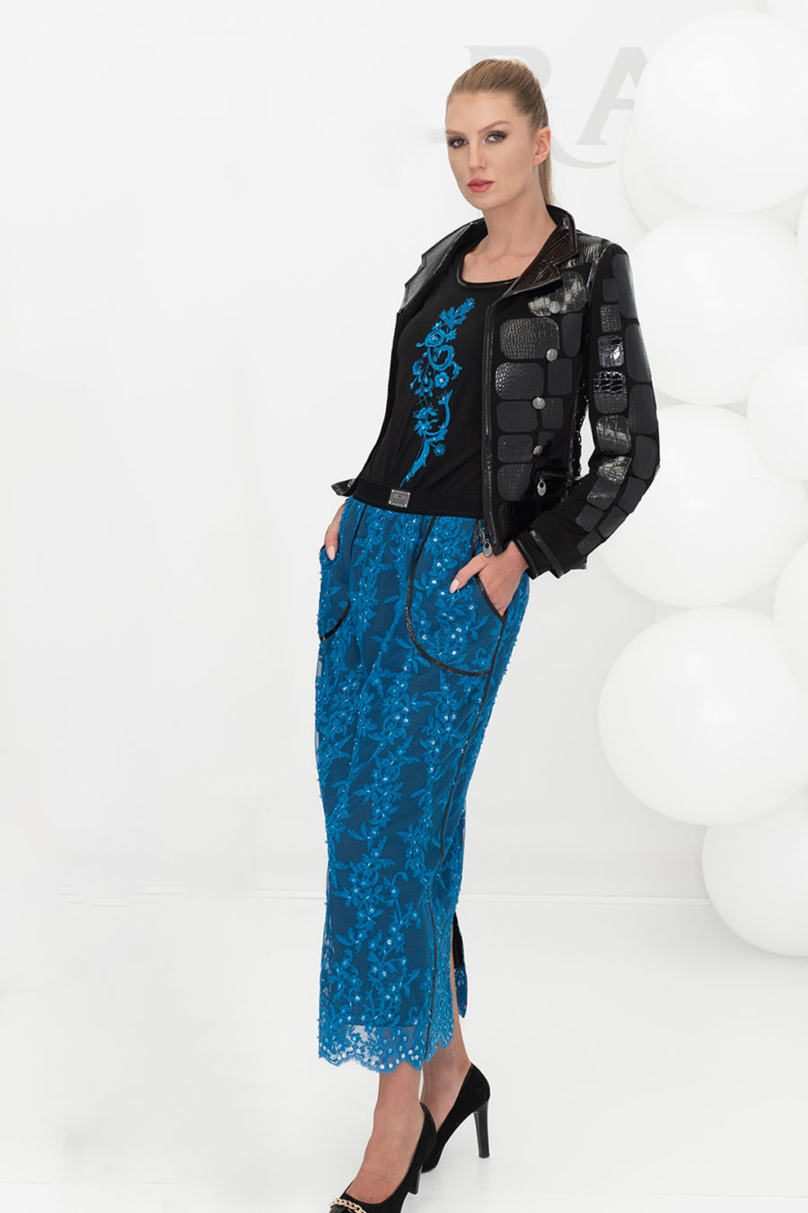 Midi Spitzenrock mit handapplizierten Perlen und Paillietten, aufgesetzten Taschen und Lackkontrasten
