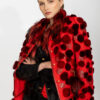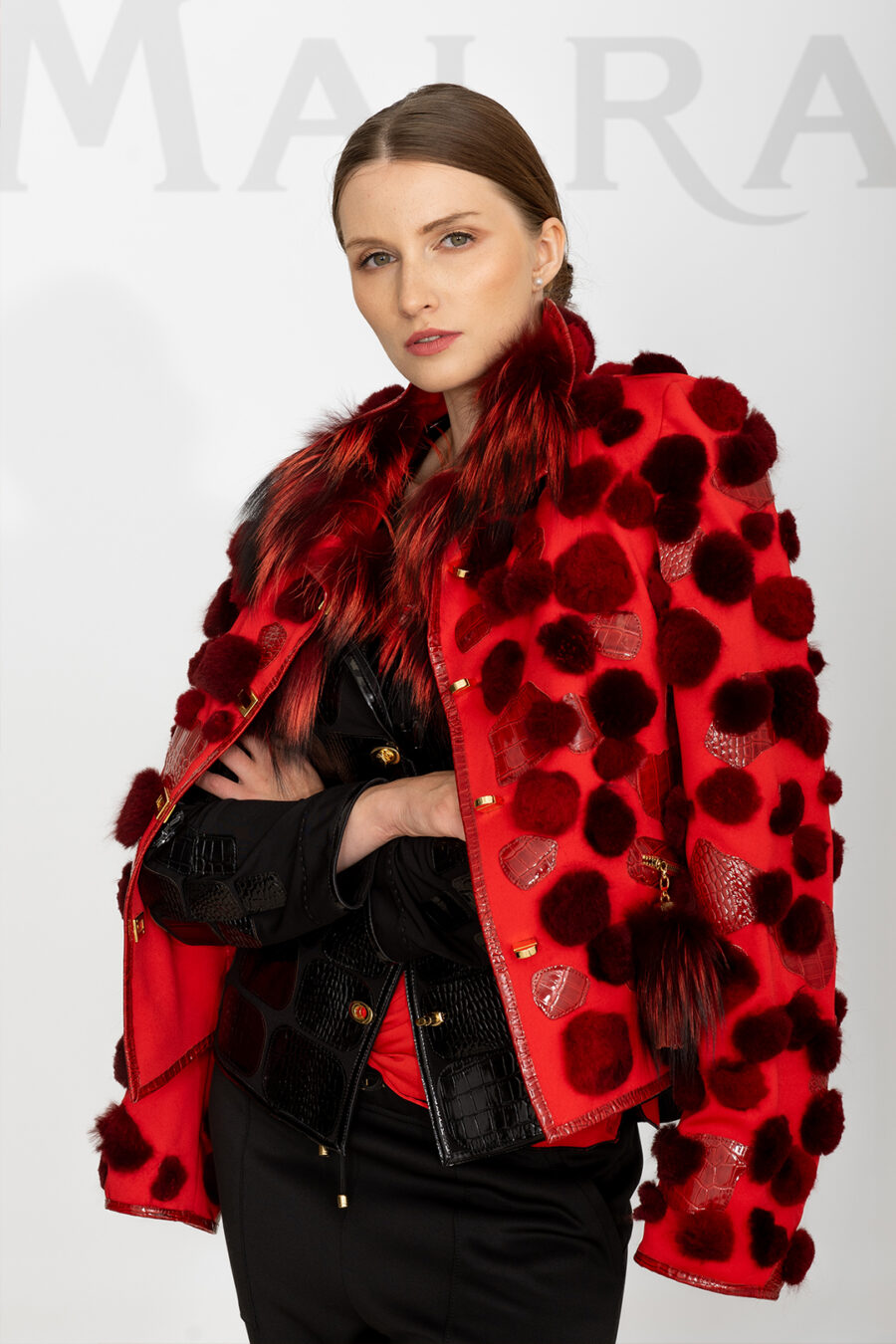 Pelzjacke mit Applikationen aus geschorenem Fuchs und Leder in Kroko-Optik, RV-Taschen, wattiert