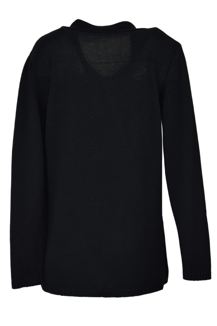 Der Pullover hat eine gerade Passform mit einem V-Ausschnitt, von dem ein Kragen mit Kordeldurchzug ausgeht, mit dem Sie je nach Belieben den Ausschnitt variieren können.