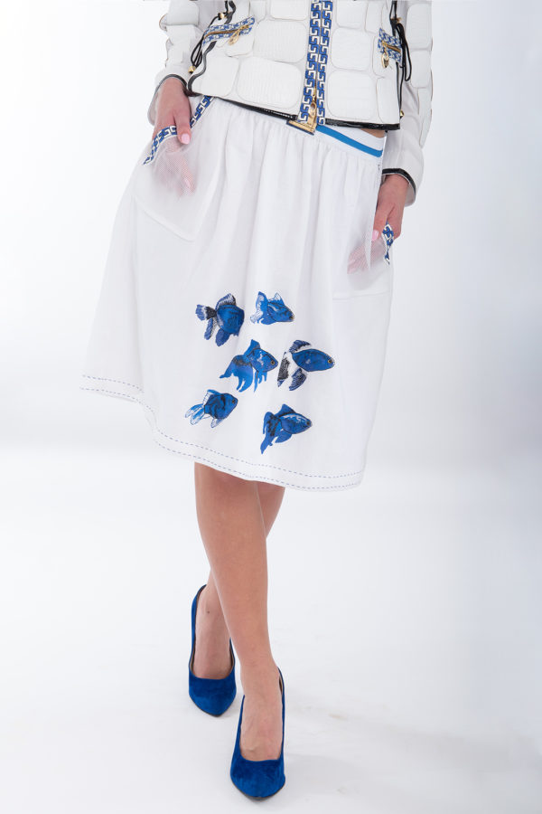 Leinenrock mit “ocean-embroidery” (2 Motive) und gestickter Bordüre an den Taschen.