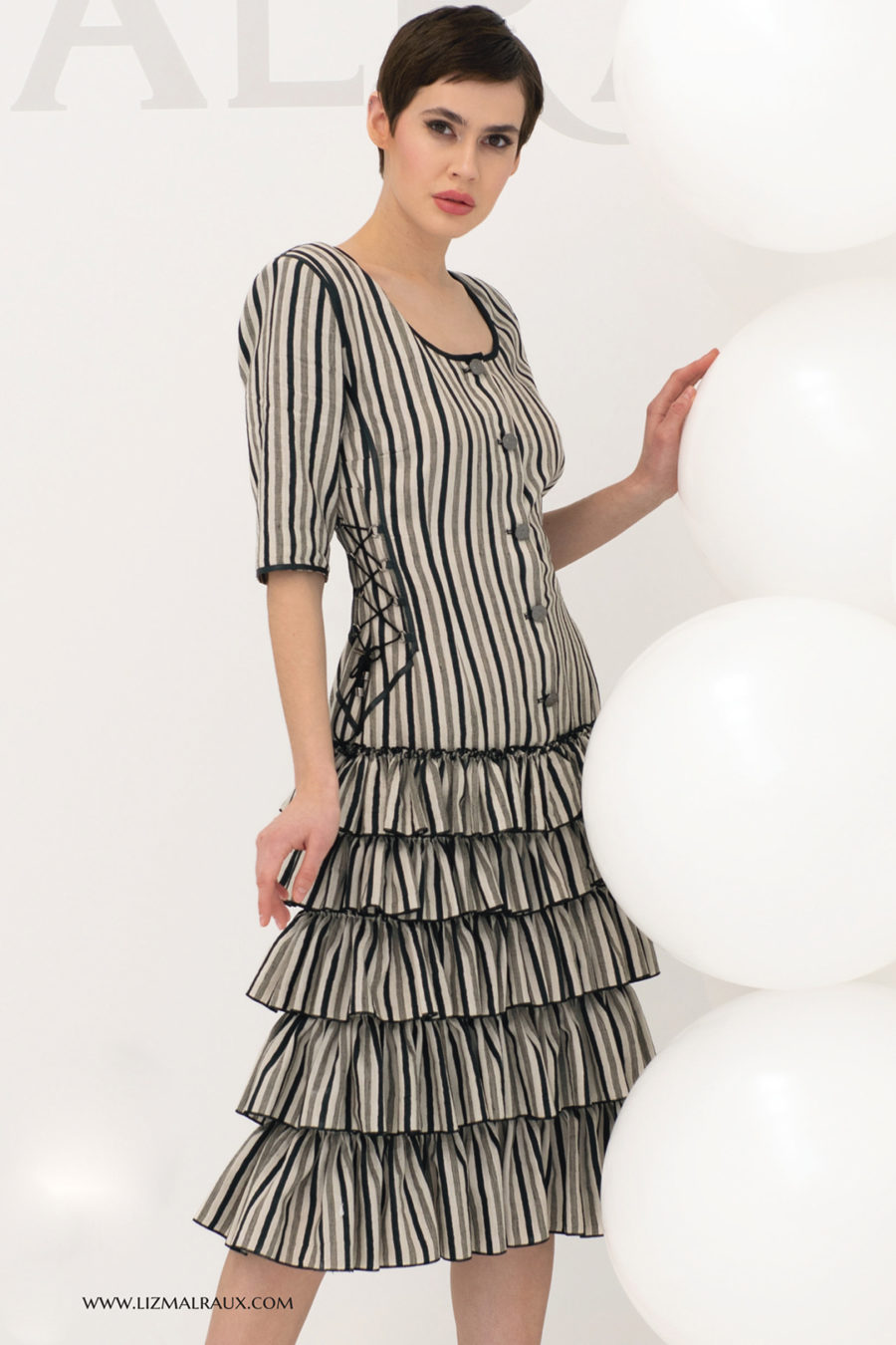 Rüschenkleid mit 5 Volants aus Leinen & Viskose, mit schwarzen Kontrasten, Titanknöpfen, Multisize