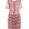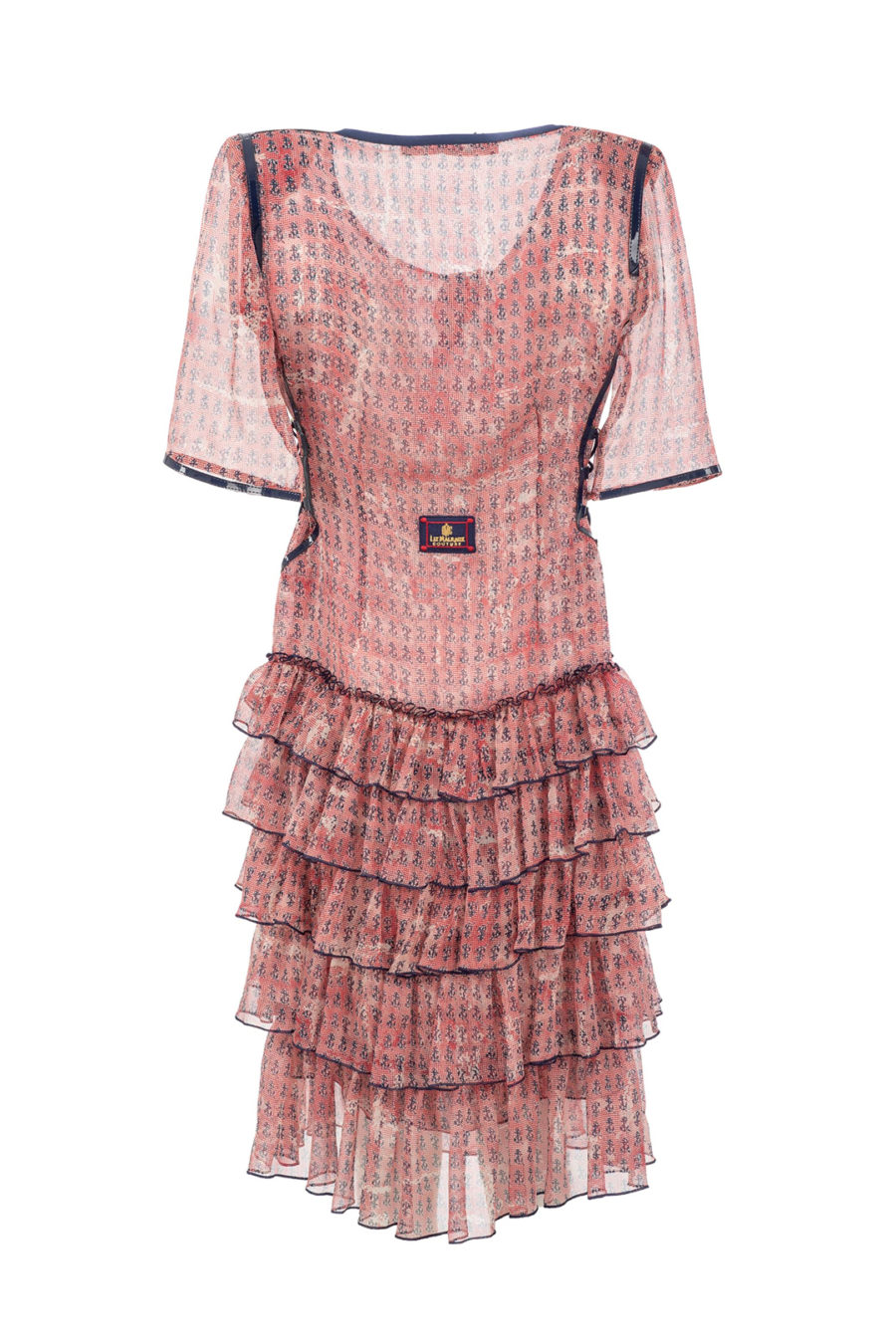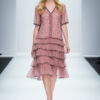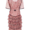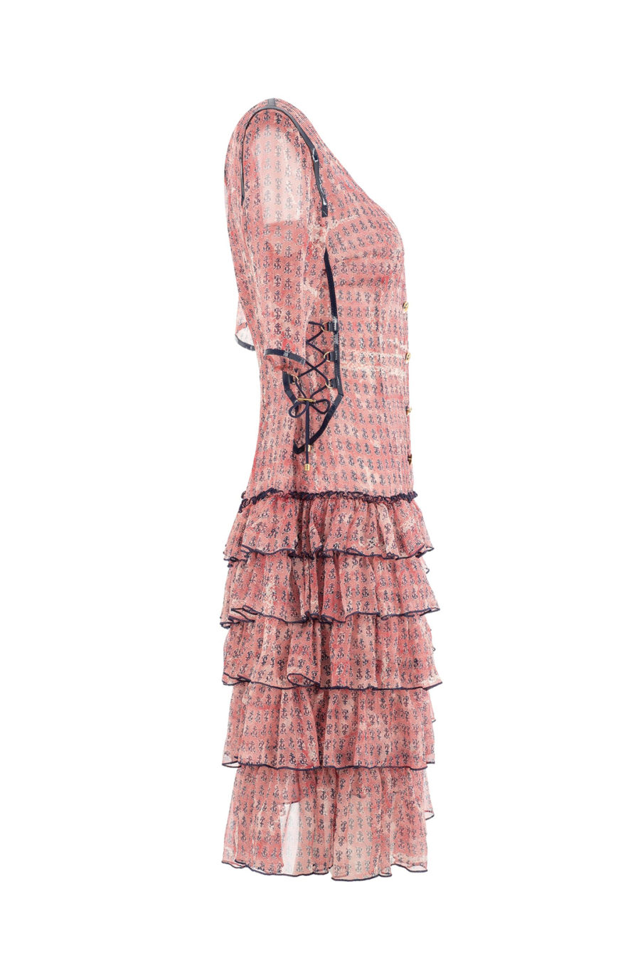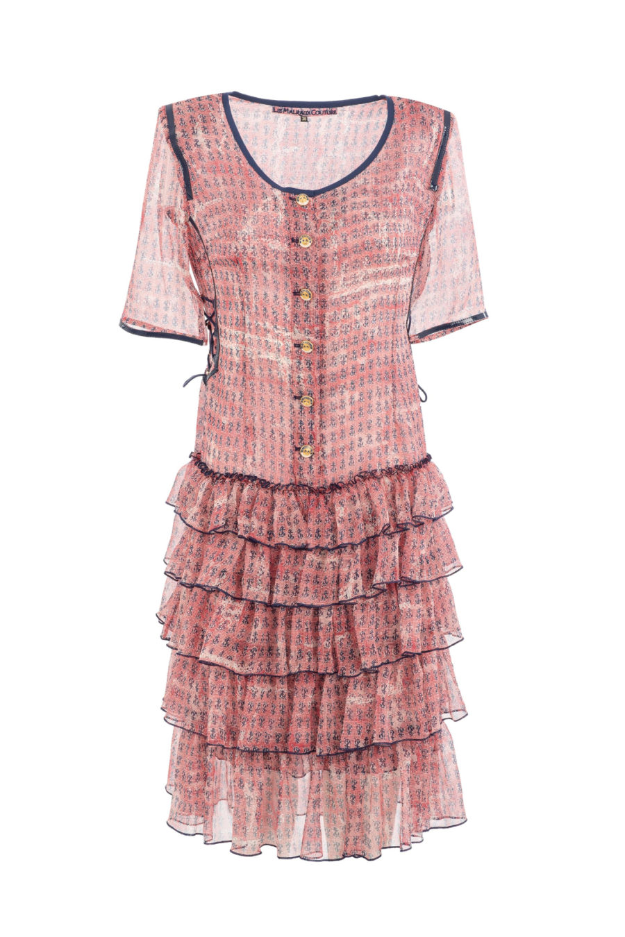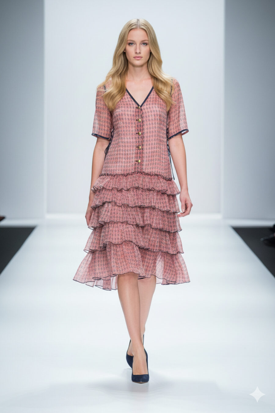 Rüschenkleid mit 5 Volants aus reiner Seide, mit marine Kontrasten, emallierten Knöpfen, Multisize