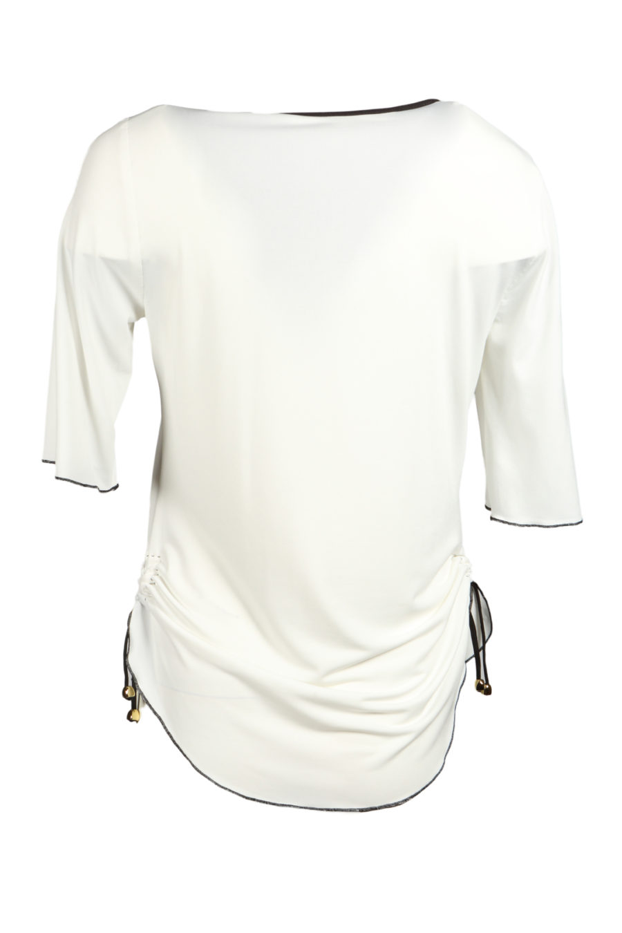 Das Shirt verfügt über seitliche Kordelzüge im Saumbereich, die eine Längenkorrektur ermöglichen und gleichzeitig eine modische Raffung entstehen lassen.