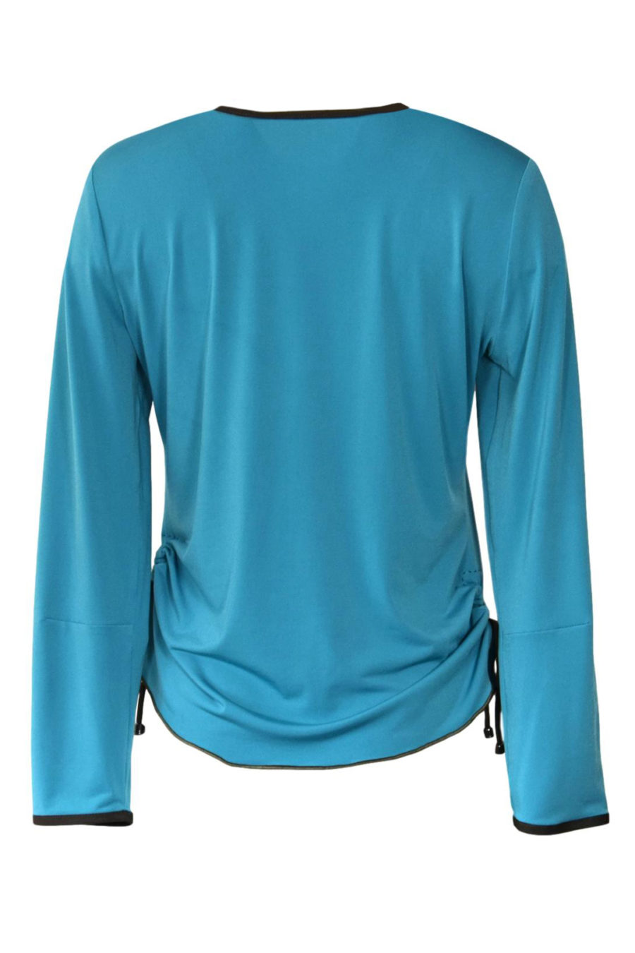Das Shirt verfügt über seitliche Kordelzüge im Saumbereich, die eine Längenkorrektur ermöglichen und gleichzeitig eine modische Raffung entstehen lassen.