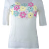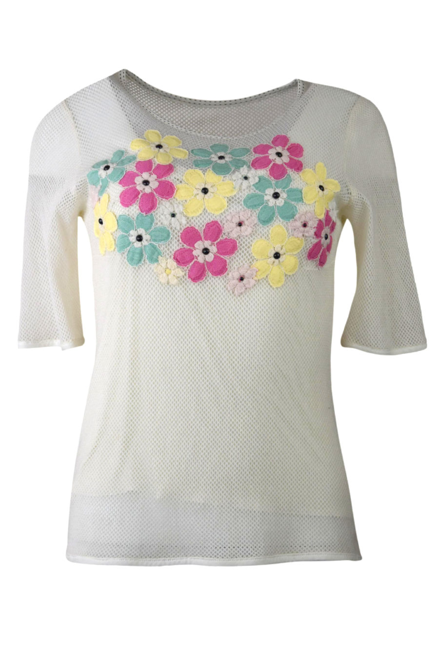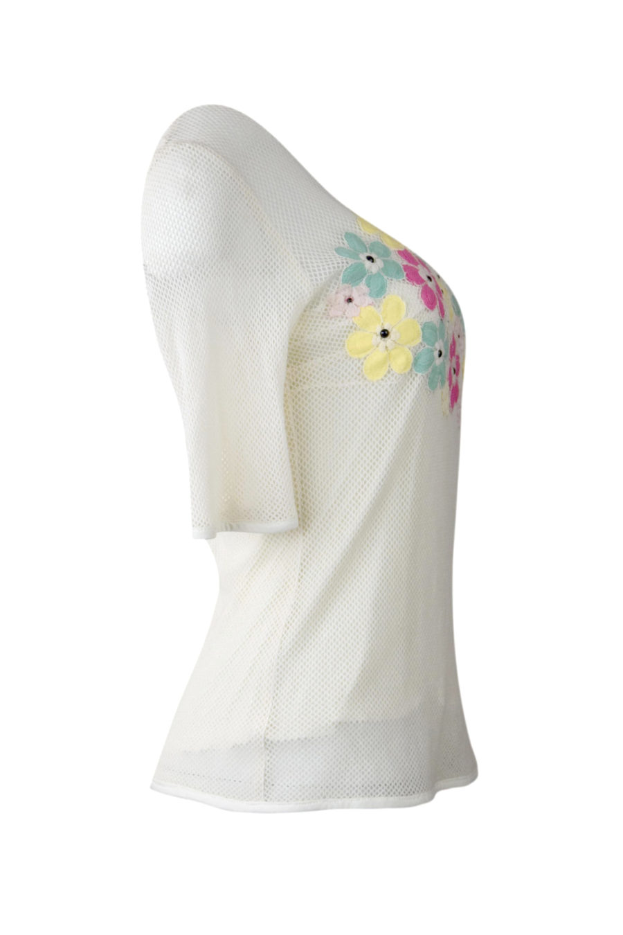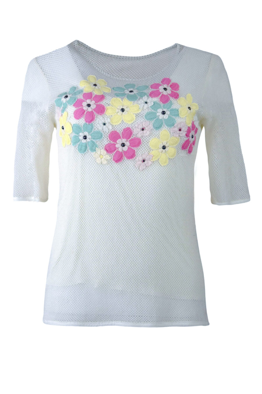 Shirt mit Netzoptik und applizierten Blumen in Multikolor, Kurzarm