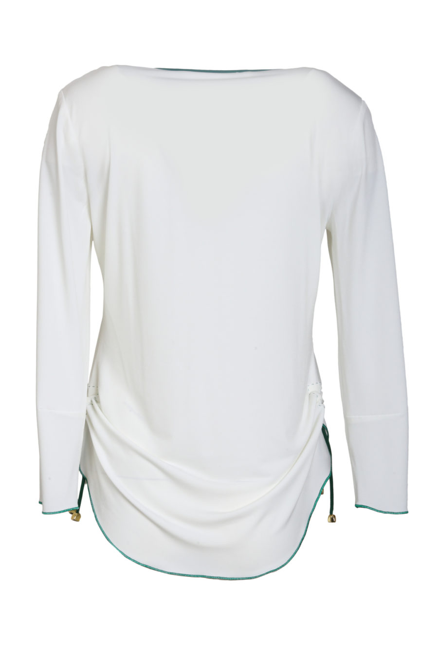 Das Shirt verfügt über seitliche Kordelzüge im Saumbereich, die eine Längenkorrektur ermöglichen und gleichzeitig eine modische Raffung entstehen lassen.