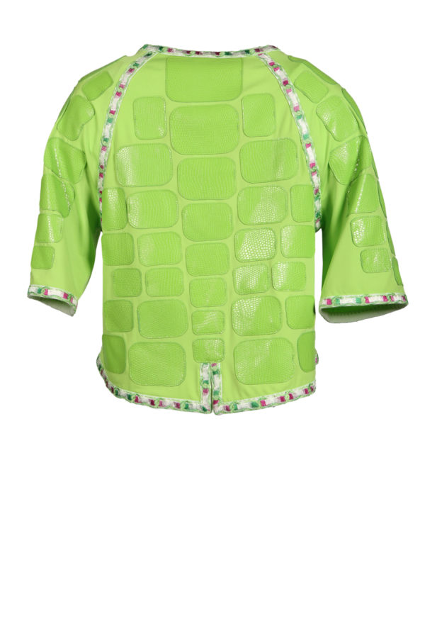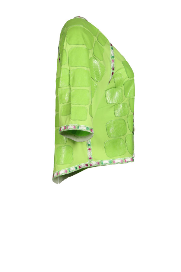Die Couturejacke ist aus pflegeleichtem Jersey, mit Krokopatches appliziert und mit einem von Liz Malraux entwickelten Stickmotiv 12-farbig bestickt.