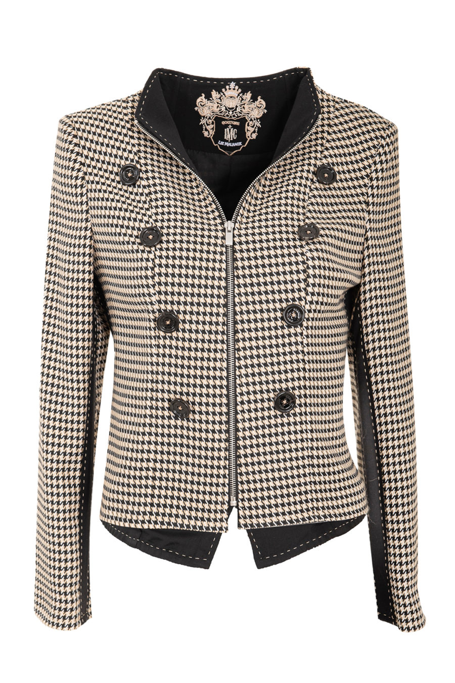 Spencerjacke aus Pepita Stoff mit schwarzen seitlichen Kontrasten und 8 Zierknöpfen, Futterstoff aus Viskose, Sicherheitstasche