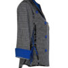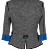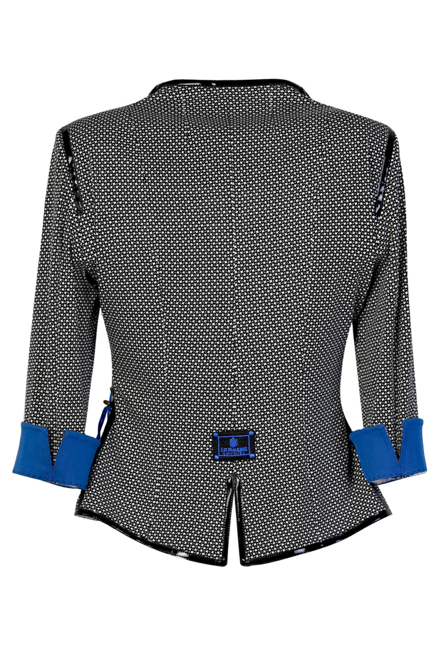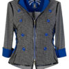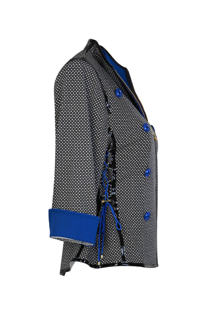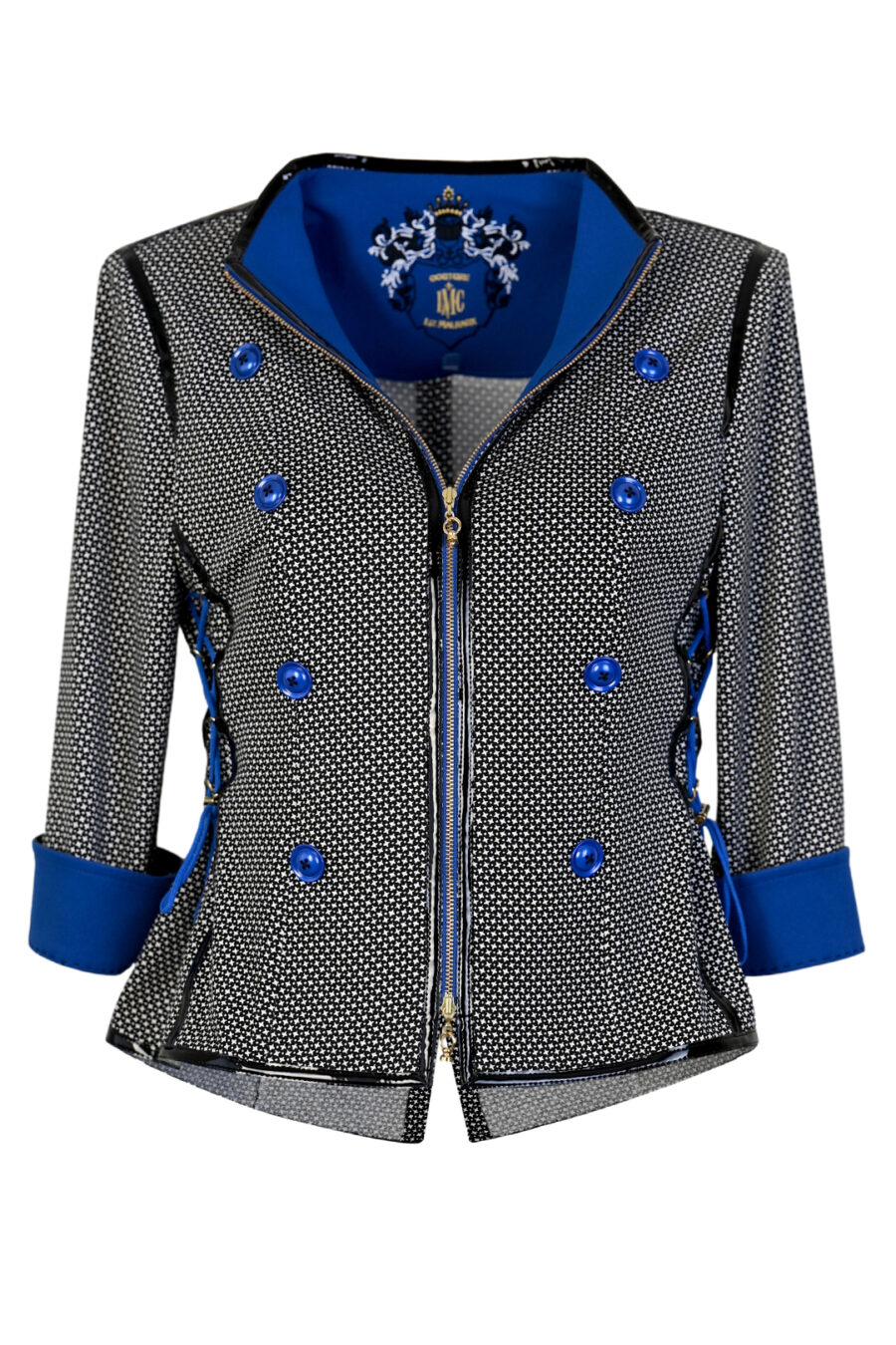 Spencerjacke aus schwarz-weißem Jersey in Krawattenmuster mit royalblauen Kontrasten, 8 Zierknöpfen, 3/4-Ärmeln & Multisize-Schnürung