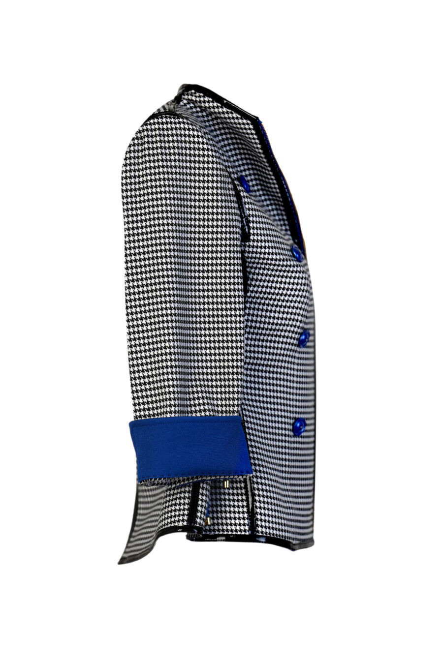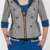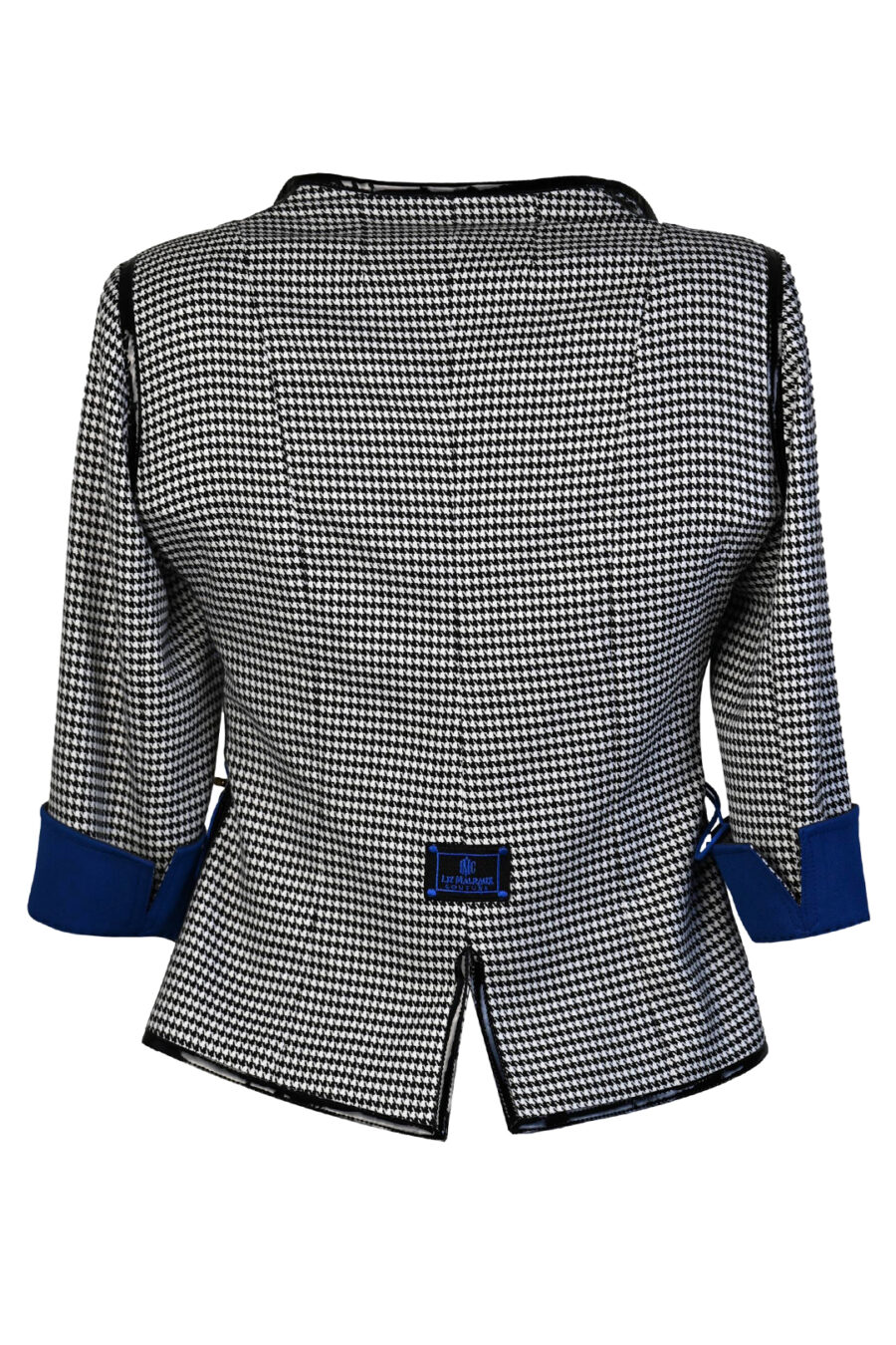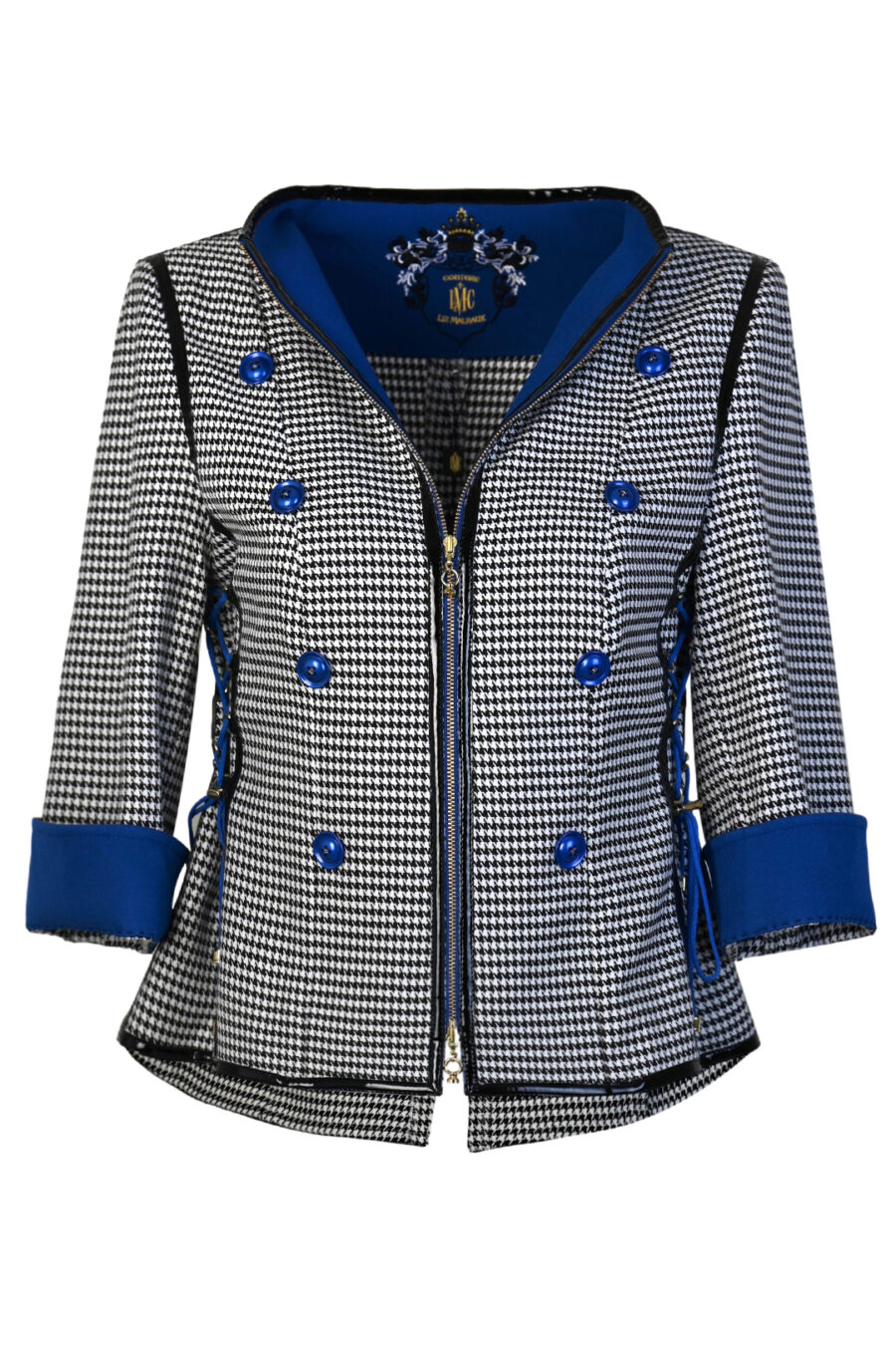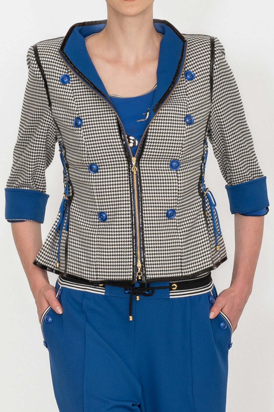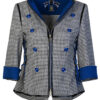 Spencerjacke aus schwarz-weißem Pepitastoff mit royalblauen Kontrasten, 8 Zierknöpfen, 3/4-Ärmeln & Multisize-Schnürung