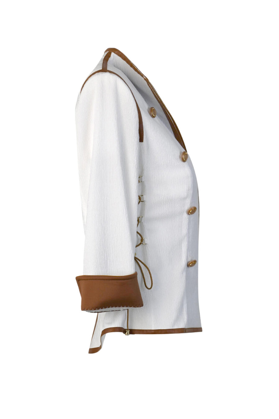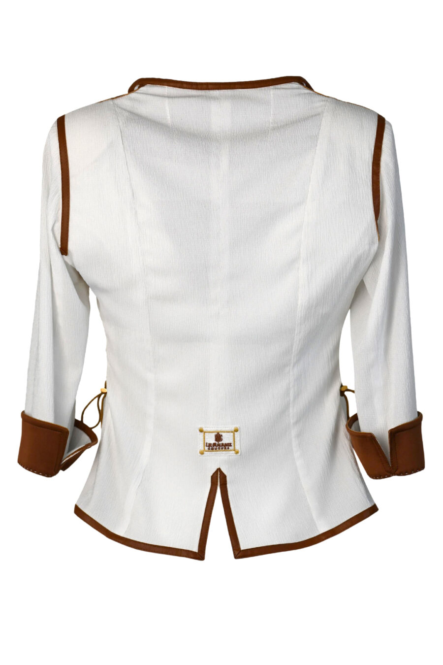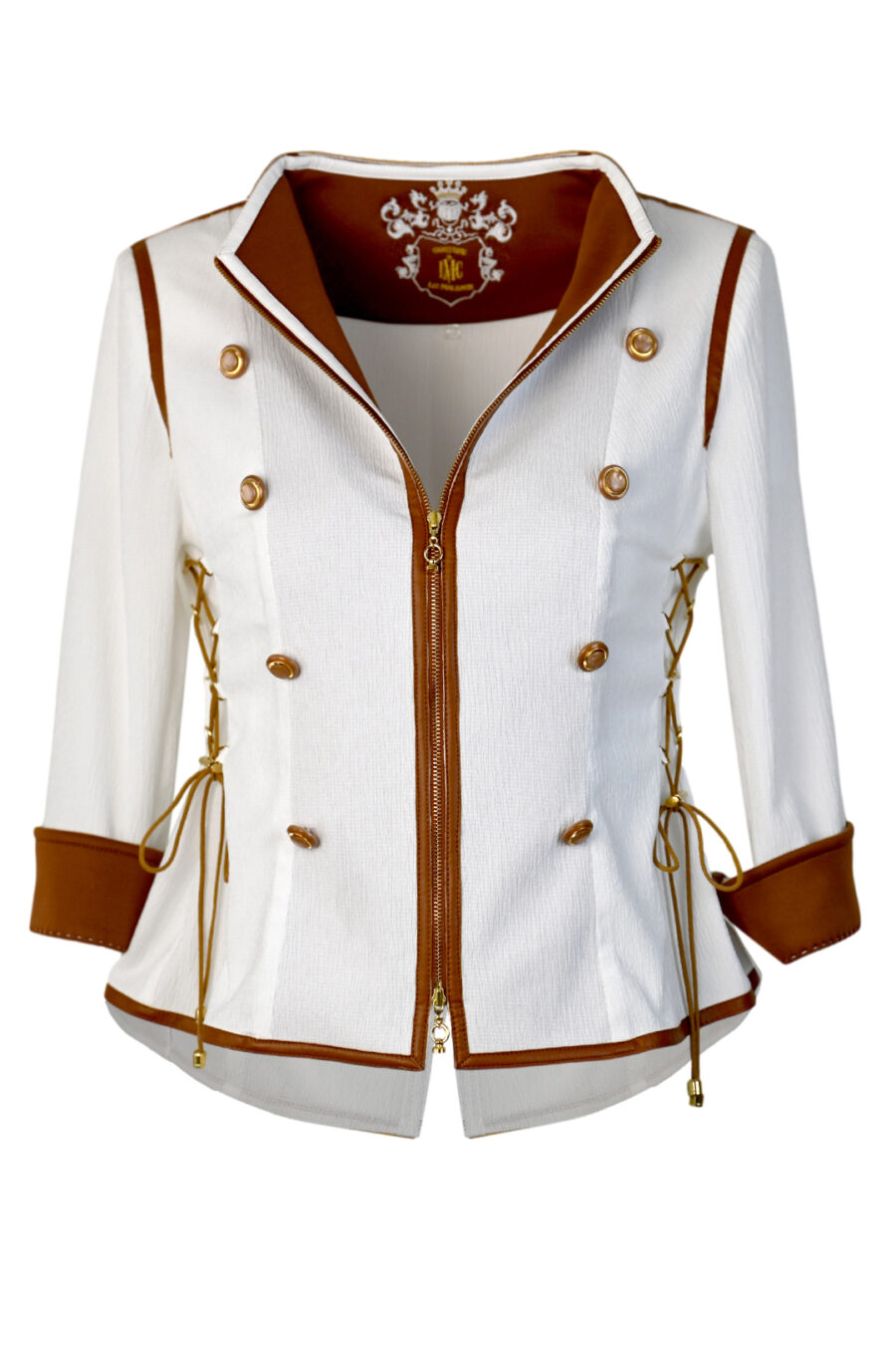 Spencerjacke in Ecru aus pflegeleichtem Crash-Material mit Cognac-Kontrasten, 8 Zierknöpfen, 3/4-Ärmeln & Multisize-Schnürung