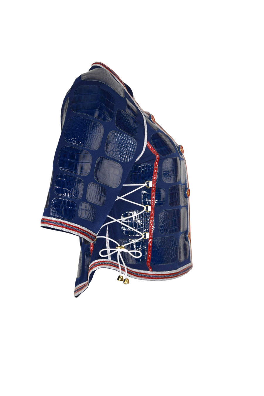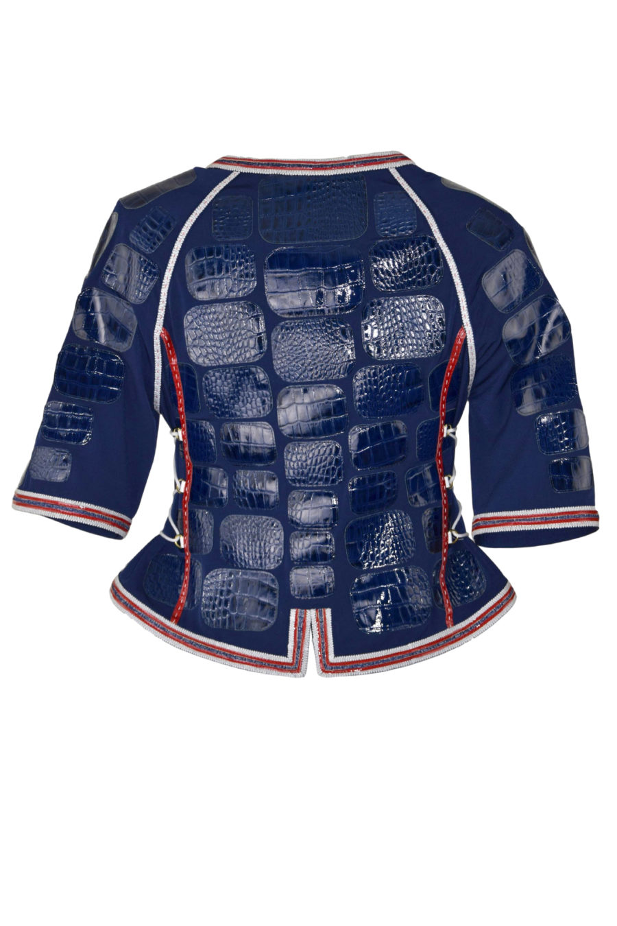 Die Couturejacke ist aus pflegeleichtem Jersey, mit Krokopatches appliziert und mit einem von Liz Malraux entwickelten Stickmotiv 12-farbig bestickt.