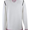 Der Pullover hat eine gerade Passform mit einem V-Ausschnitt, von dem ein Kragen mit Kordeldurchzug ausgeht, mit dem Sie je nach Belieben den Ausschnitt variieren können.