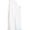 Der Pullover hat eine gerade Passform mit einem V-Ausschnitt, von dem ein Kragen mit Kordeldurchzug ausgeht, mit dem Sie je nach Belieben den Ausschnitt variieren können.