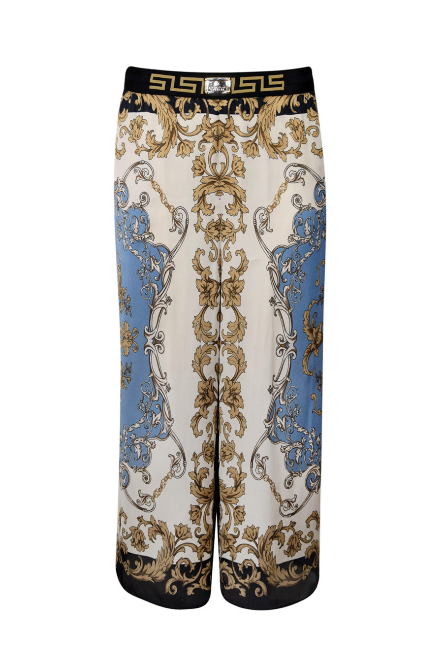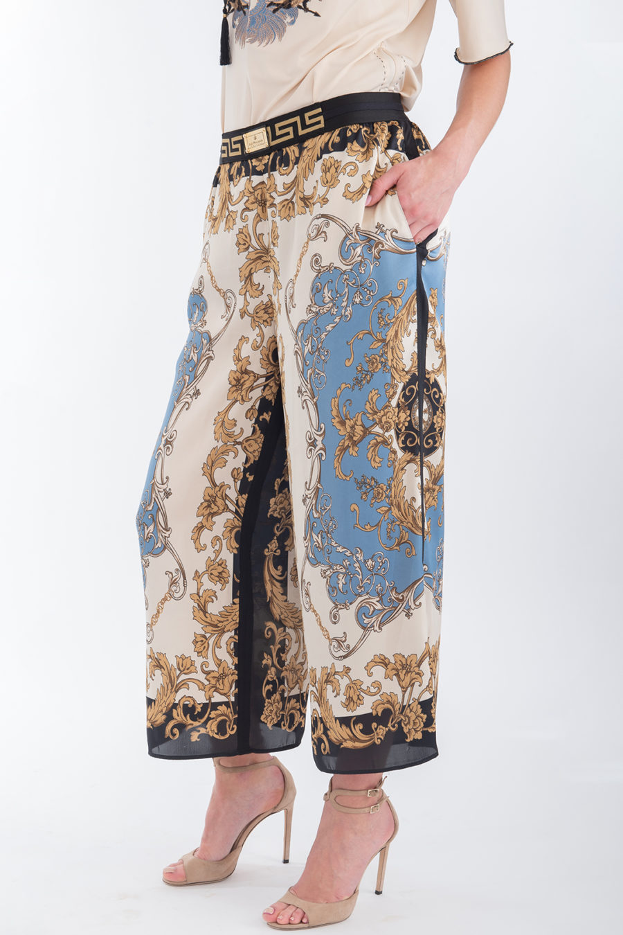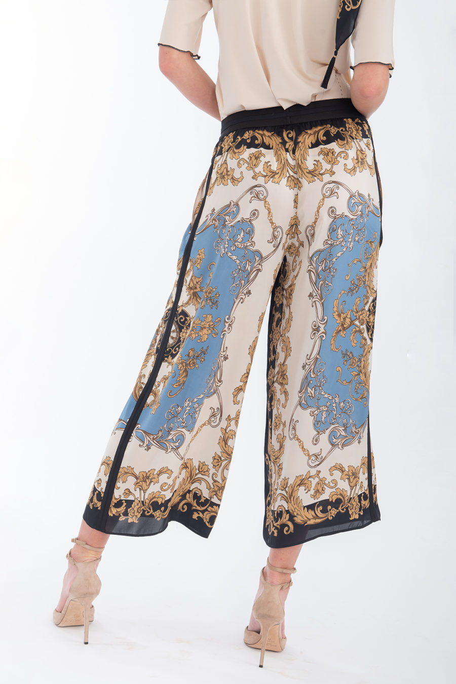 Weite Hose aus Tuchprint in 7/8 Länge mit elastischem Bund, seitlichen elastischen Einsätzen und Eingrifftaschen