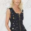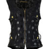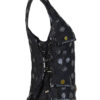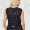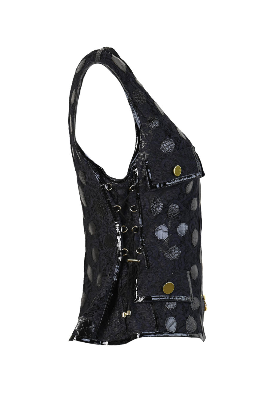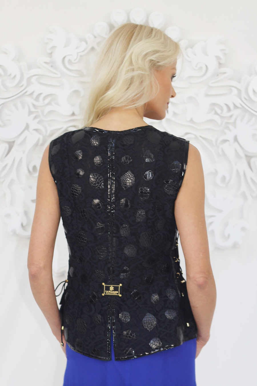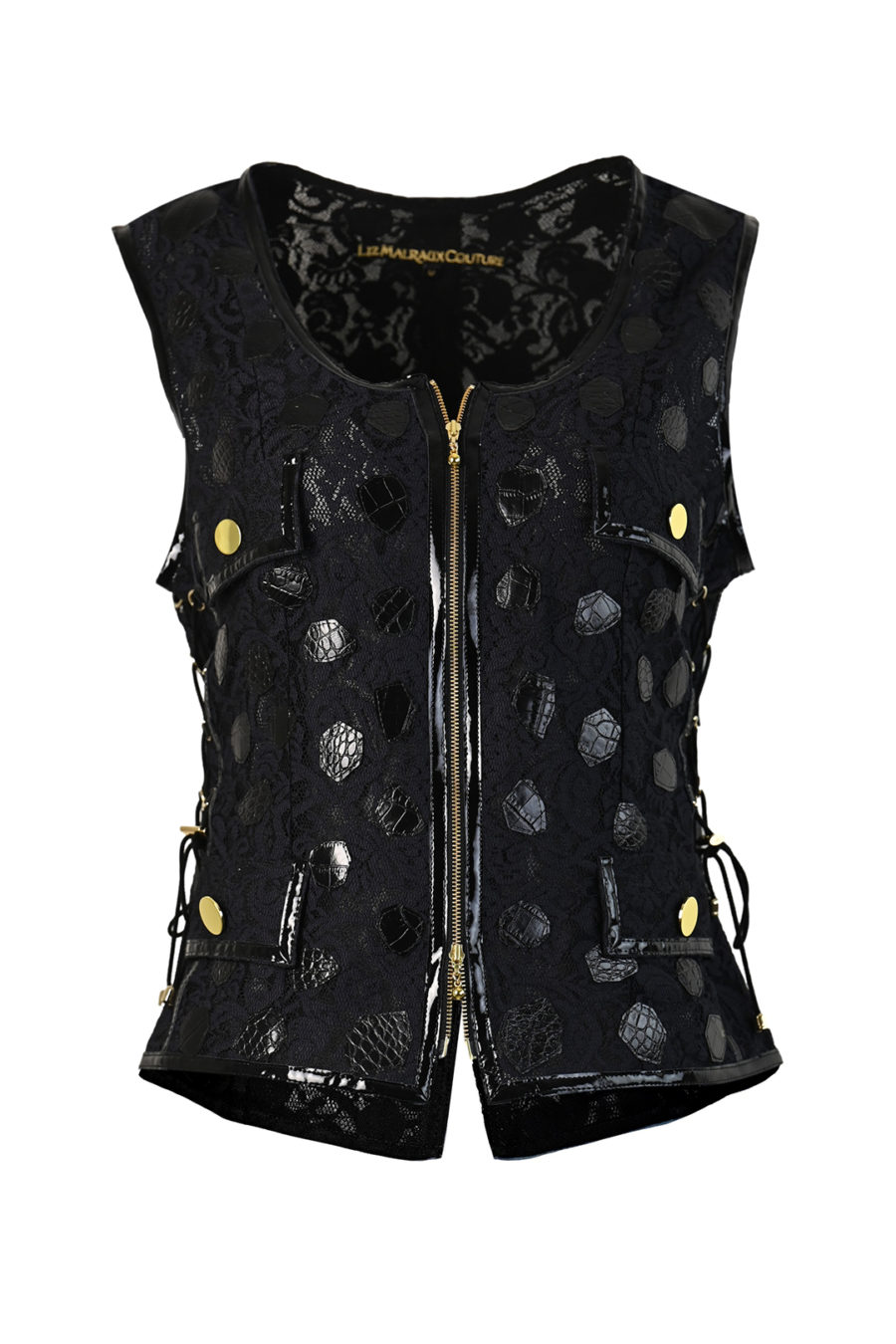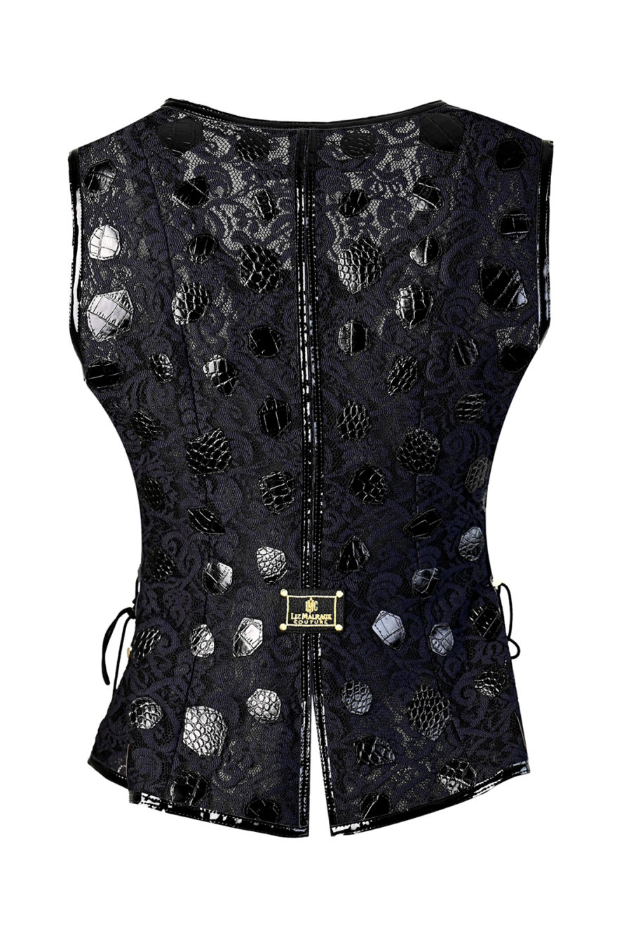 Weste mit 4 Patten und schwarzen Lackkontrasten aus elastischer Spitze, mit über 100 Lederpatches in Krokopoptik appliziert