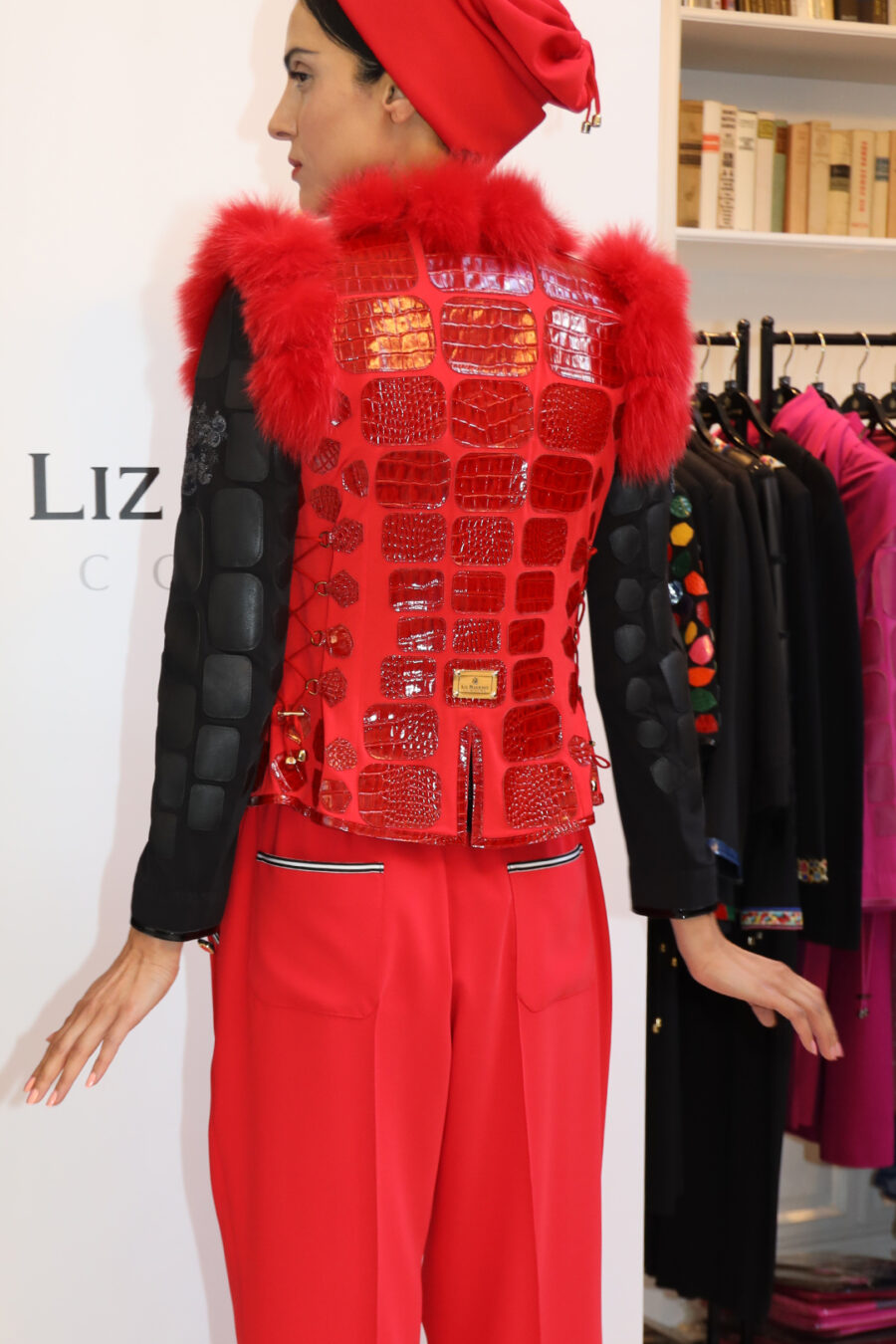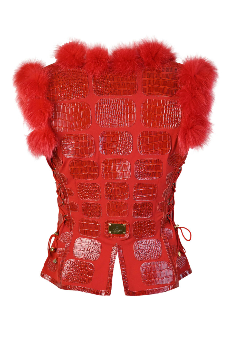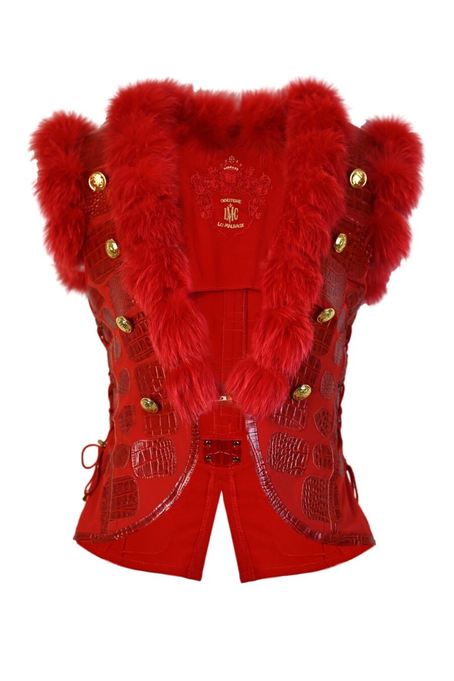Weste mit Lederpatches in Kroko-Optik und Fuchsverbrämung, 8 Zierknöpfen und Multisize Schnürung und Sicherheitstasche